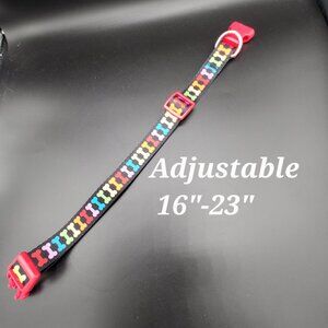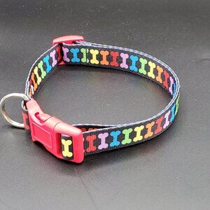 Adorable dog collar featuring a fun rainbow bone pattern on a black background. Designed with a sturdy red quick-release buckle and metal D-ring for easy leash attachment or ID tags. Lightweight, adjustable, and comfy for everyday wear.