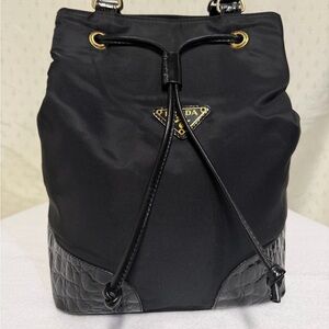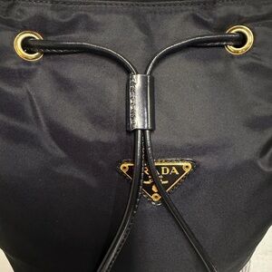 Authentic Prada Black Nylon Drawstring Bucket Hand bag Leather base