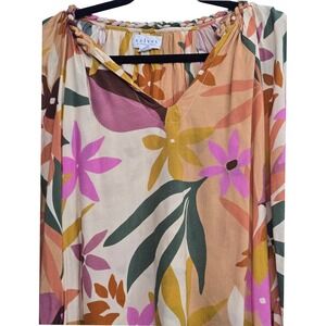 Velvet by Graham & Spencer women's blouse in size small. This charming top features a vibrant floral print with shades of pink, peach, olive green, and mustard yellow on a cream background. The design includes a V-neckline with a gathered neckline detail and a tie accent, long balloon sleeves with elasticized cuffs, and a relaxed fit. The fabric is 100% viscose for a soft and flowing feel.