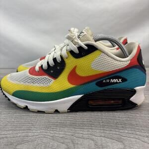 Get noticed in these vibrant Nike Air Max 90 Hyperfuse sneakers. This pair features a bold, multi-color palette including White, Yellow, Red, Green, and Orange. The Hyperfuse construction ensures a lightweight, breathable fit while the classic Max Air unit provides iconic cushioning and style.