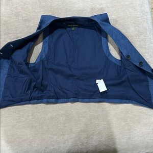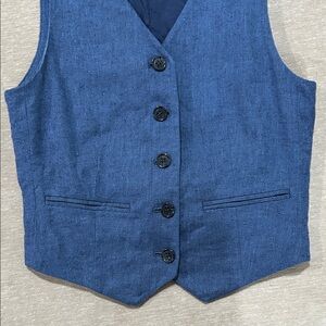 Elegant navy vest with button closure. This vest is a nice navy blue with five black buttons on the front and has watch pockets. Also has adorable buckle feature on the back which adds another pretty factor to this vest