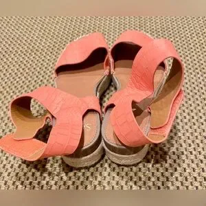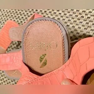 Chic coral sandals with croc-embossed design. Perfect for casual outings.