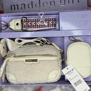 This 3-Piece Crossbody set from madden girl includes a Sherpa crossbody bag, 2 interchangeable straps and an additional pouch to ensure you have enough space to store all of your necessities.