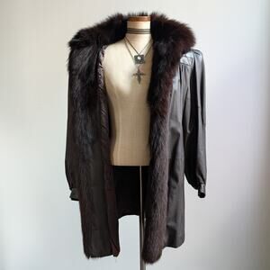 Vintage Black Leather Fox Fur Penny Lane Trench Coat Minimalist Duster Jacket
