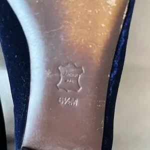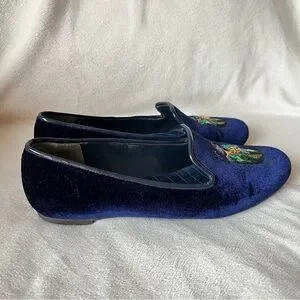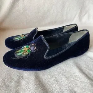 Rare Tory Burch Easton smoking slippers in navy blue velvet. Feature an iridescent embroidered beetle/scarab detail. Pre-owned condition with some sole wear.