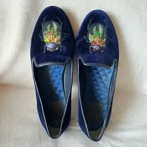 Tory Burch, Easton, Beetle, Scarab, Velvet, Navy Blue, Loafers, Flats, Embroidered, Rare, Poshmark Canada