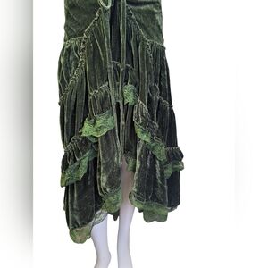 This is a straight-up woodland siren / fae queen piece — a lush moss green velvet convertible dress/skirt with romantic lace trim and dramatic draping. The adjustable drawstring + tie details let you wear it multiple ways (strapless dress, halter, skirt, layered over knits, etc.), so you can style it from festival to witchy-cottagecore with zero effort.