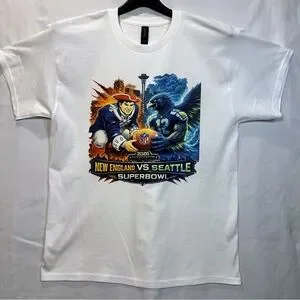 New Homemade DTF Graphic Dynamic Gildan t-shirt featuring New England vs Seattle Superbowl design. Bold blue and orange graphics. Perfect for Super Bowl Weekend!