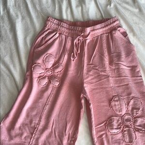 Stylish pink wide-leg pants featuring floral embroidery. Comfortable and chic for any occasion.