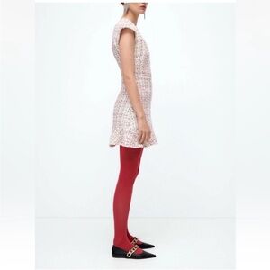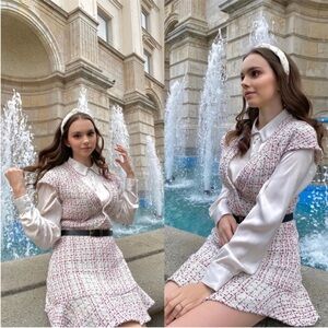 Chic tweed mini tweed dress with a V-neck. Features pink and cream tones. Perfect for versatile styling.
