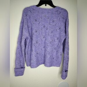Chic lavender V-neck sweater by Democracy. Features intricate knit design. Ideal for casual wear.