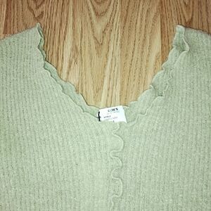 Stay cozy and stylish with this beige colored sweater featuring a charming scalloped edge. Perfect for any casual outing.