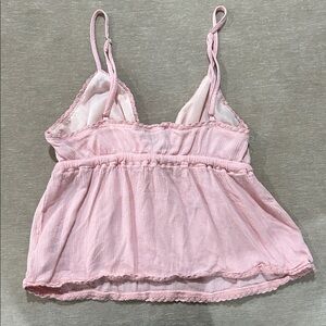Chic and comfortable pink spaghetti strap top perfect for any casual outing. Enjoy the soft fabric and stylish design. This cute babydoll top has a string below the bust the ties so you can adjust it as needed. Also has a bit of pink lace around all the hems.