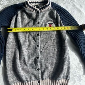 Classic collegiate style knit cardigan by Renu (Bruzer) featuring the iconic University of Toronto Varsity Blues crest. Soft, heavyweight knit with ribbed cuffs and hem, button-front closure, and contrast sleeves for a true varsity look. Great layering piece for fall, winter, or campus wear.