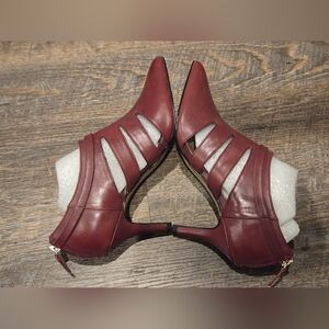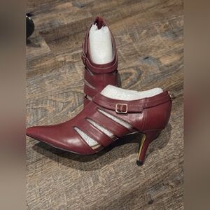 Part bootie, part pump, completely chic, this pointy toe style features flirty side cutouts and a slender belt circling the topline.