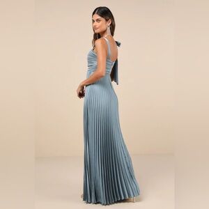 New Lulus Gorgeous Purpose Slate Satin Pleated Sleeveless Bow Maxi Dress Large