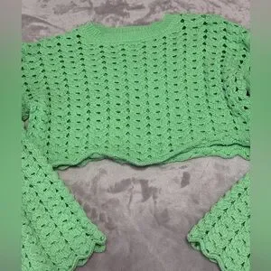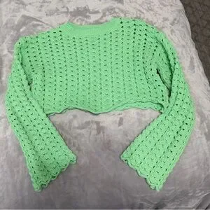 Stylish light green crochet crop top. Perfect for casual outings. Unique and trendy design.