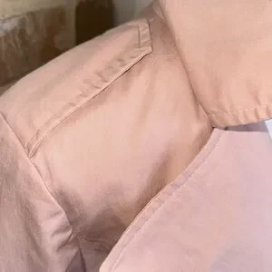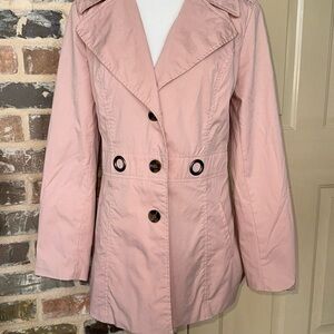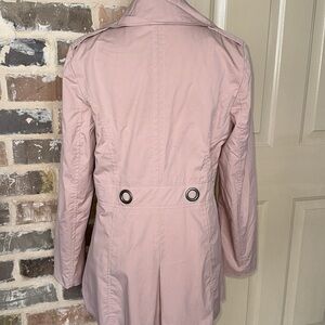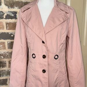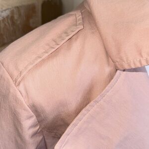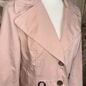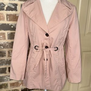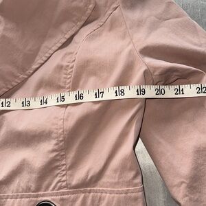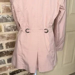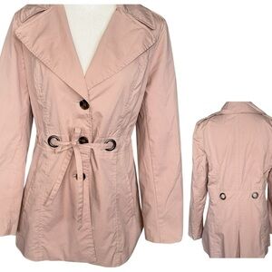 Sandro Studio Tannish Peachy Rose Trench Coat Utility Jacket in Size Medium. Roomy through the chest and waist for a classic fit. Single breasted button closure front; Removable self-tie belt with Bronze tone grommets in front and rear. Vented Rear Hem. Two exterior pockets; Fully lined. Approximate measurements in photos. Excellent condition.