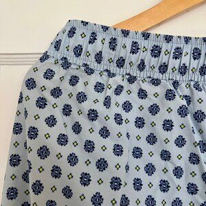 Boxer style pj pants in blue pattern with contrasting bandana scarf pattern at bottom.