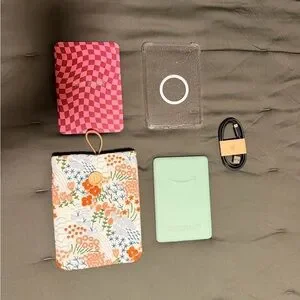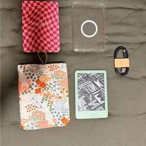 Kindle Basic with a matcha green frame. Includes a pink checkered case, a floral pouch, a clear protective cover, and a charging cable.