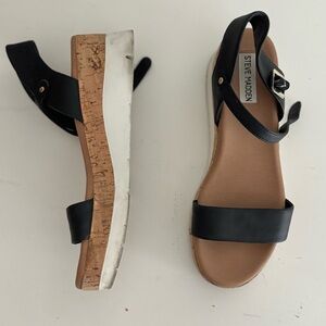 Steve Madden Rosalita Stacked Cork Platform Leather Strap Lightweight Wedge Sandals, Black, 8