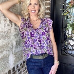There is nothing sweeter than the Trifle Top, a sleeveless, plum floral blouse that pairs effortlessly back to other hues in the Collection. This sheer, flirty top features a classic button-up design with ruffle detailing throughout for a feminine touch. No camisole included.