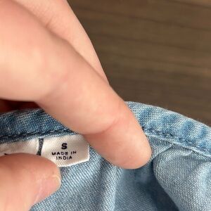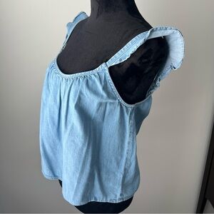 Light blue camisole with adjustable ruffle straps. Perfect for casual wear. Soft and comfortable chambray fabric.