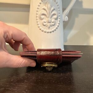 This Chelsea Card Wallet is crafted from a soft croc embossed leather in color wine. There are four card slots on the exterior and a flap closure. There is an antiqued brass oval trim and eagle head embellished with crystals on the flap closure.