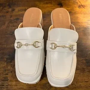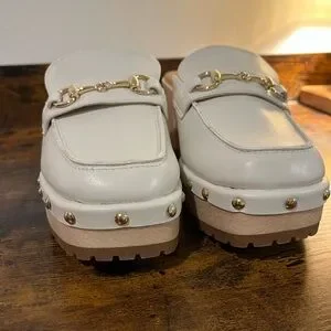 Chic cream mules with gold stud detailing. Comfortable platform design. Perfect for stylish outings.