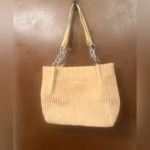 New in package cordoroy/chenille tote bag in beige. This is a light weight run around tote bag. It has faux leather straps and silver rings attached to handles. Bag scarf included.