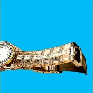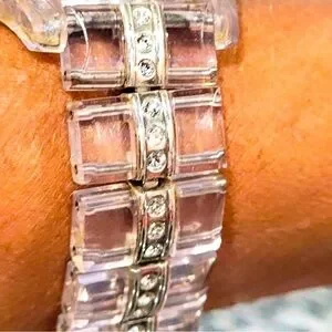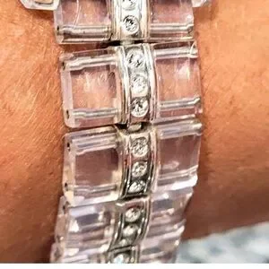 No missing stones watch has been gone over by a Jeweler before sending out. Beautiful Crystals none missing. This is a clear band watch is retired no tarnish