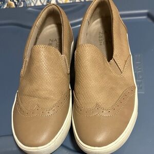 Elegant brown loafers with a textured finish. Comfortable slip-on design. Perfect for casual wear.
