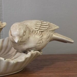 Keywords: ceramic candle holder, bird decor, shell motif, vintage home accent, tabletop decoration, cottagecore, shabby chic, garden accent, gift for bird watcher, spring decor, romantic accent, taper candle holder