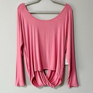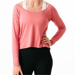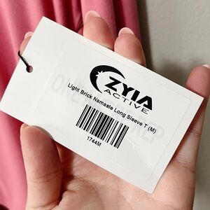 Brand new with tags ZYIA Active Light Brick Namaste Long Sleeve Tee in pink. Size medium. Open back with draping fabric. NWT- writing on interior care tag.