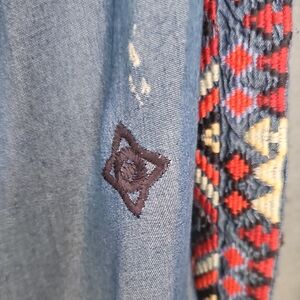 Embroidery: Intricate, multi-colored geometric and floral patterns on the back, sleeves, and hem.