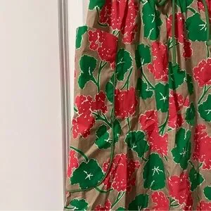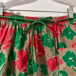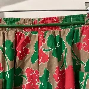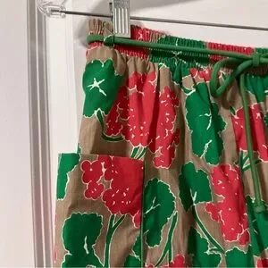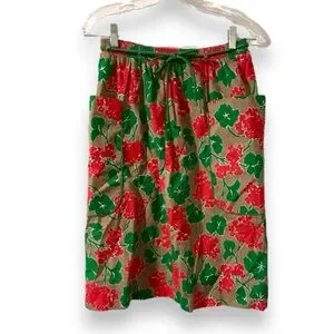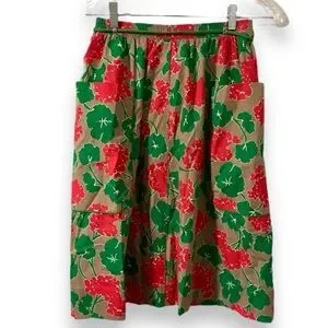 Vintage 70a/80s tan skirt with red and green flowers. Features large side pockets, green piping, a stretch elastic waist, and green string belt. So cute and retro, unique and rare!