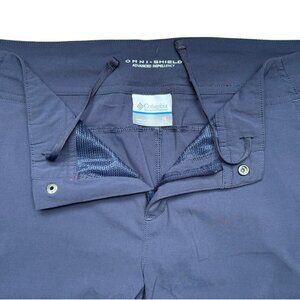 Columbia Omni-Shield advance repellency dark blue shorts in women’s size 10, inseam 11". Button zipper closure with inner drawstring. Has side pockets. Good pre-loved condition. Soft, lightweight material, perfect for the outdoors and warm weather hiking!