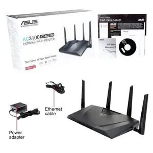 • Package Contents: RT-AC3100 Gigabit Router, RJ-45 Cable, Power Adapter, Quick Start Guide, Warranty Card (no longer valid), Support CD (User manual & Utility software)