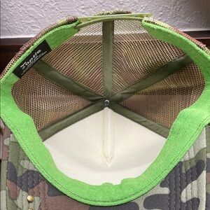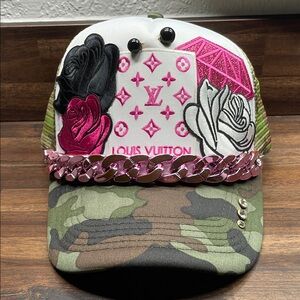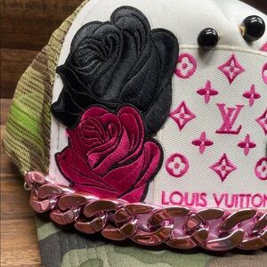 Bold Louis Vuitton cap with camouflage pattern and pink floral accents. Features chain embellishment for a chic look.