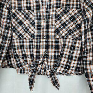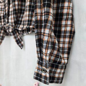 This is a beautiful and stylish, Plaid crop-top, long sleeve shirt. Colors are, black, grey, white, & orange. Features: two functional chest pockets, three buttons down the front, V-neck, sleeves have a button at the cuff, and has a tie front at the bottom. This shirt is brand new with its tags.