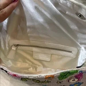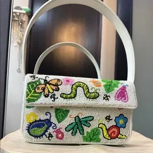 Stylish white shoulder bag with vibrant embroidered patterns. Features playful designs for a unique look.