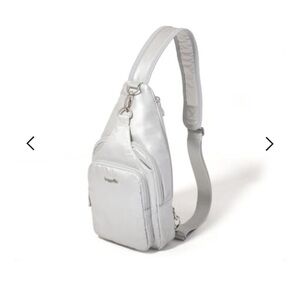 Stylish silver backpack by Baggallini. Ideal for everyday use. Combines fashion and practicality.