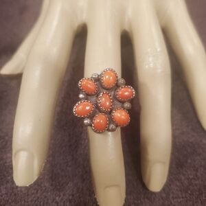 Gorgeous vintage Native American sterling silver coral ring with seven