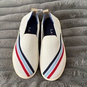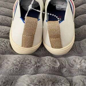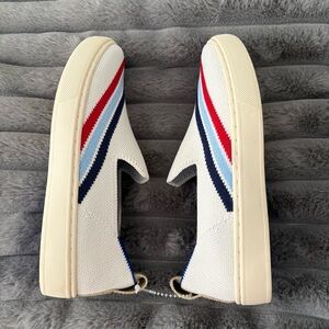 “Spirit Stripe" detail (white sneaker with red and blue stripes across toe)