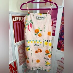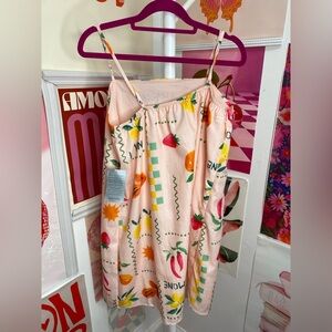 Vibrant pink dress with fruit print. Features oranges, lemons, and strawberries.