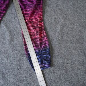 Embrace vibrant energy with these striking Danskin active leggings. The eye-catching ombre stripe design transitions from deep blue and purple to bright pink, creating a dynamic visual appeal. The ruched detailing at the ankle adds a fashionable touch, elevating your workout or casual wear. Perfect for hitting the gym, running errands, or enjoying a relaxing weekend.