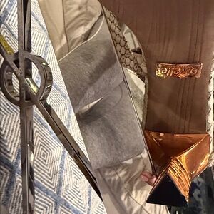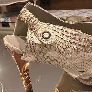 Omelle Elegant Cream/Grey Skin Sandals 37 1/2 - Bronze Stacked Heel NEVER worn