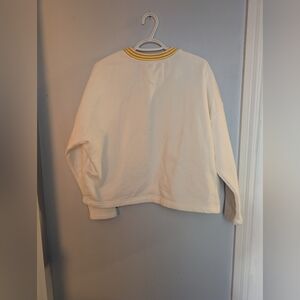 Sporty heritage-style sweatshirt by HB STRIPES, featuring a cream base with mustard striped ribbed neckline and statement embroidered patches down one sleeve. Varsity-inspired details with a slightly cropped, relaxed fit—great for casual wear or layering.