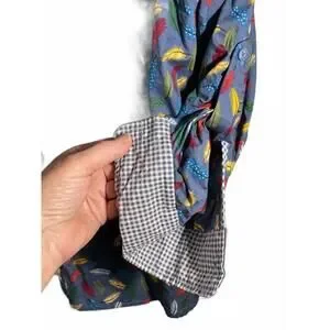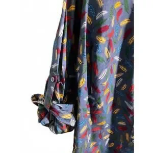 Brighten up your wardrobe with this fun and vibrant feather print button-up shirt. Featuring a mix of colorful feathers on a blue background, this shirt adds a playful touch to any casual outfit. The inner collar has a contrasting gingham pattern for an extra pop of style. Comfortable and lightweight, it's perfect for everyday wear or casual outings.