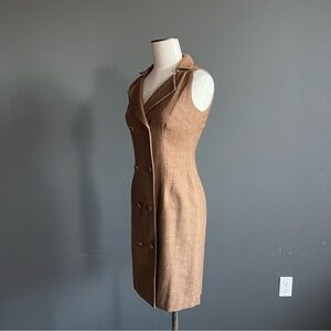 vintage raw silk dress, silk noil dress, sleeveless blazer dress, double breasted dress, brown silk dress, tailored vintage dress, minimalist workwear, petite vintage dress, classic womenswear, neutral capsule wardrobe, quiet luxury style, 90s office chic, structured dress, natural fiber clothing, timeless tailoring